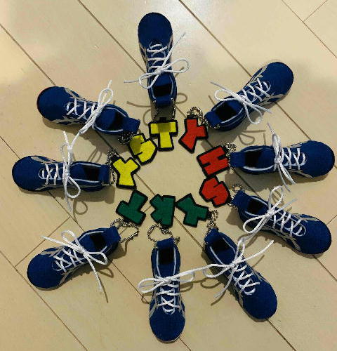 マスコットでつくられた輪が、夏の大会に向けた強いチームワークを感じさせます。カラフルな靴紐もきれいですね。ありがとうございました。