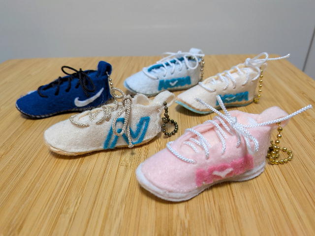 「先日は靴のマスコットの型紙ありがとうございました。なんとかインターハイを直前にして、娘が完成させたところです。写真をいくつか送ります。ありがとうございました。」