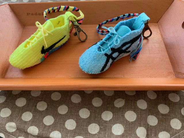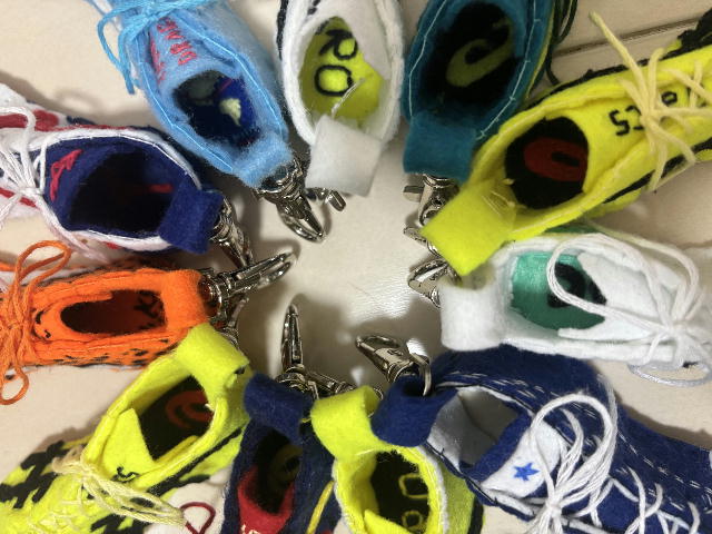 「先日は靴のマスコットの型紙ありがとうございました。なんとかインターハイを直前にして、娘が完成させたところです。写真をいくつか送ります。ありがとうございました。」