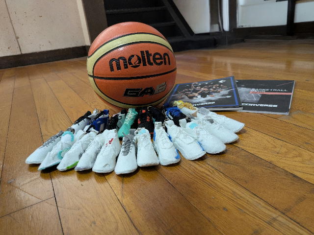 体育館の床に置かれたバスケットボールとウェアカタログ、そして20個の手作りマスコットたち…。とてもすてきな写真ですね。ありがとうございました。